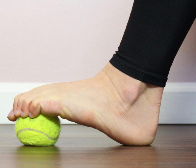 Зажимая мячик пальцами ноги, мы тем самым укрепляем подошвенную фасцию.