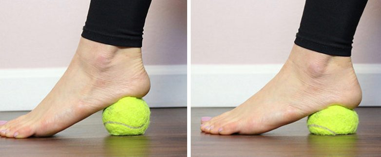 Плавно перекатываем мяч нижней стороной стопы по всей ее длине. Останавливаемся, если обнаруживаем болезненный участок и задерживаемся на нем в течение полминуты. Проработав ногу, меняем на другую и продолжаем упражнение.