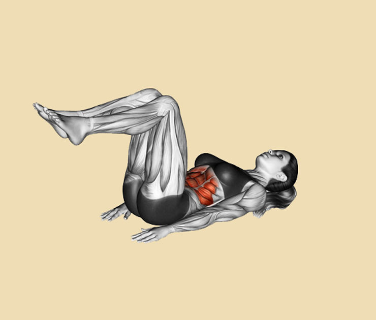 1. ИП — лежа на спине. Поднять правую руку вверх и одновременно согнуть левую ногу, скользя стопой по поверхности, — вдох. Вернуться в ИП — выдох.2. ИП — лежа на спине. Руки на поясе. Приподнять голову и плечи, посмотреть на носки — выдох. Возврат в исходное положение — вдох.