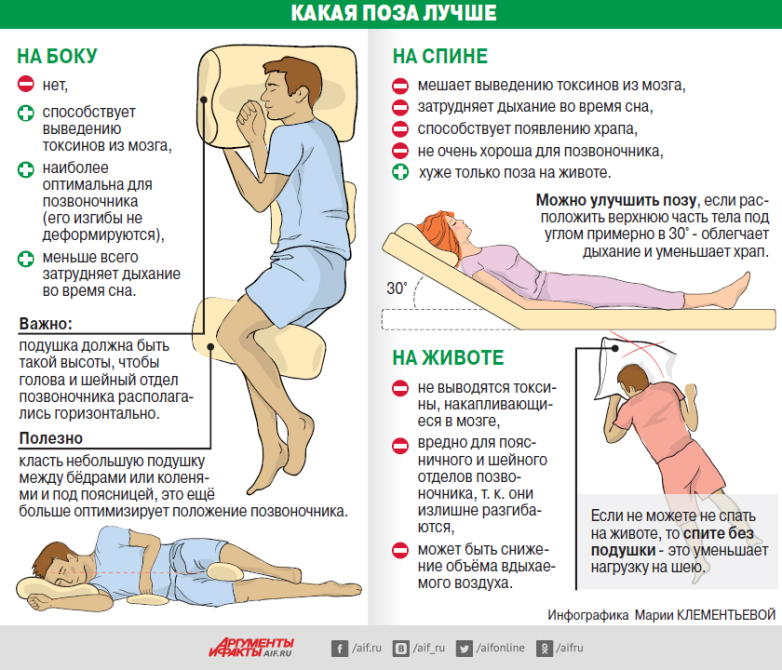 «Сон на животе с повернутой набок головой не рекомендуется, так как позвоночник сжимается всю ночь, а шейный отдел позвоночника также находится в неправильном положении, что может привести к болям в шее, руках и плечах на следующий день», — говорят медики и ученые.