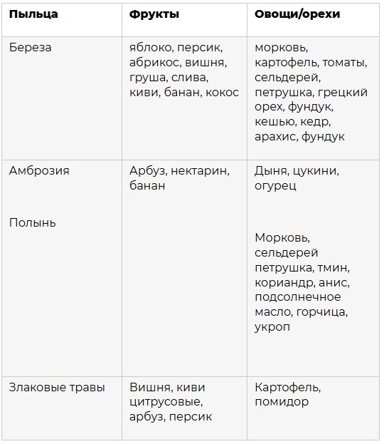 Например, белковые (аллергенные) молекулы пыльцы березы совпадают на 70 % с рядом фруктов, овощей и орехов. «В результате возникает перекрестная аллергия между аллергеном березы (Betv 1) с соответствующими участками аллергенов яблок, моркови, вишни, груши, киви, лесного ореха, сельдерея, сои, арахиса, — продолжает врач. — Другой аллерген березы (профилин) перекрестно реагирует с профилинами яблок, банана, ананаса, картофеля и томатов. Поэтому в период цветения березы необходимо отказаться от продуктов с перекрестной реактивностью, поскольку они будут усиливать симптомы аллергии».